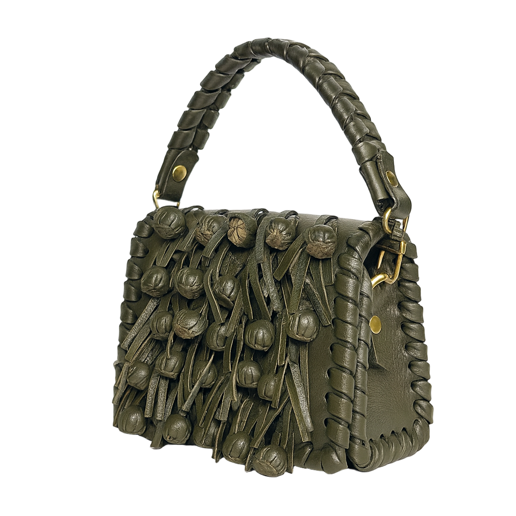 The ClaireDe Lune features hand cut fringe mixed with the mini version of our signature hand sculpted leather balls. Hand lacing around the exterior. This bag is carefully crafted to showcase exceptional details, while showing off it's hand craftsman Color Shown in Pale Yellow