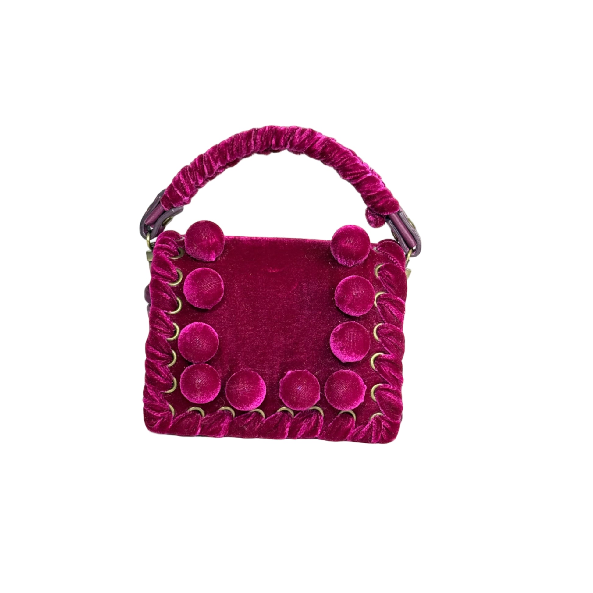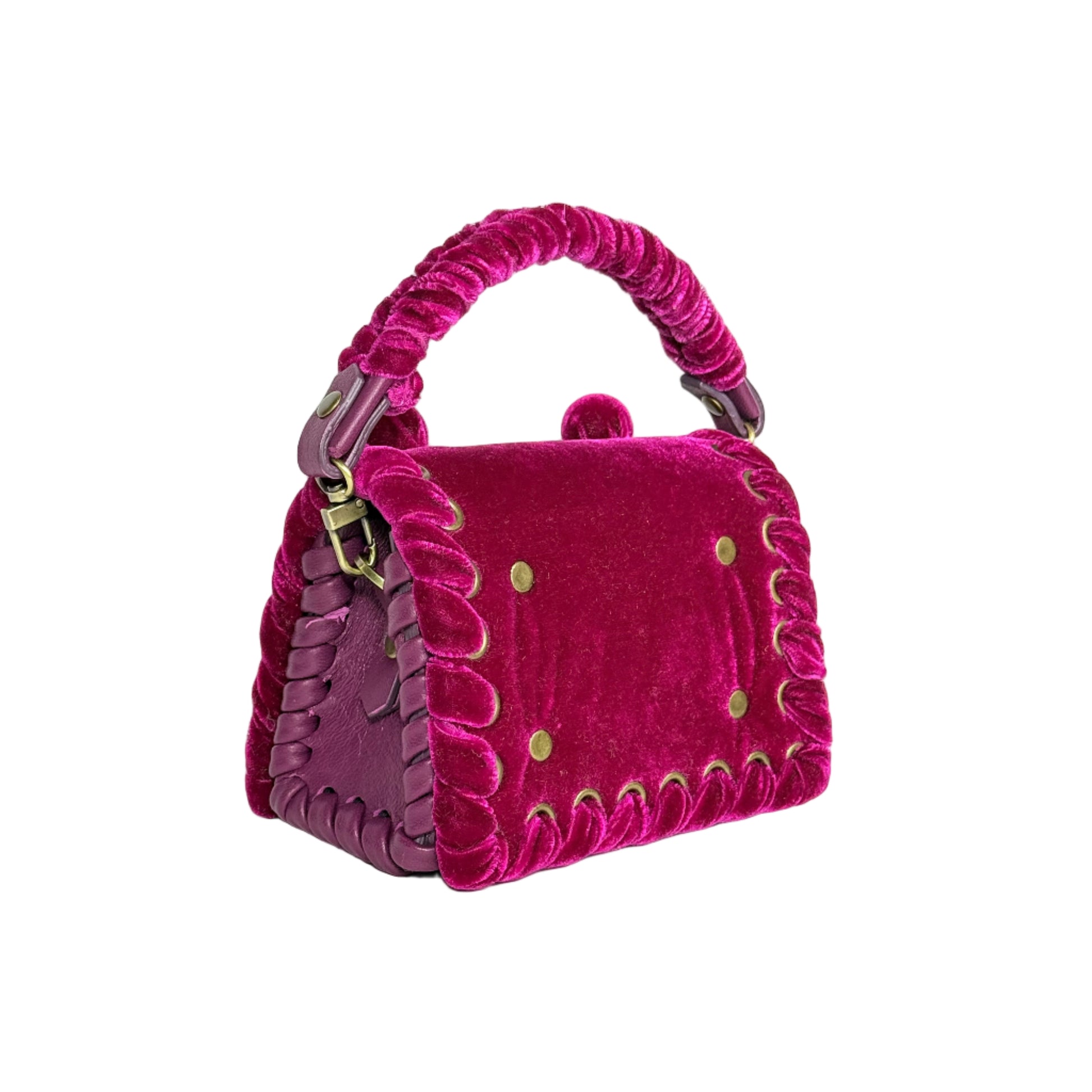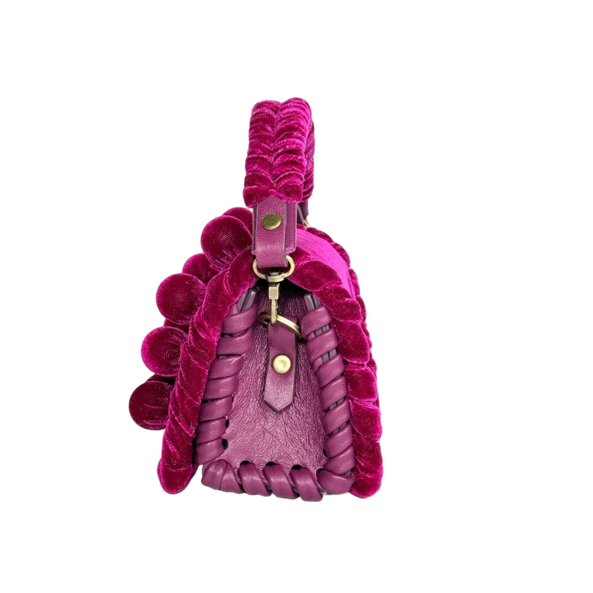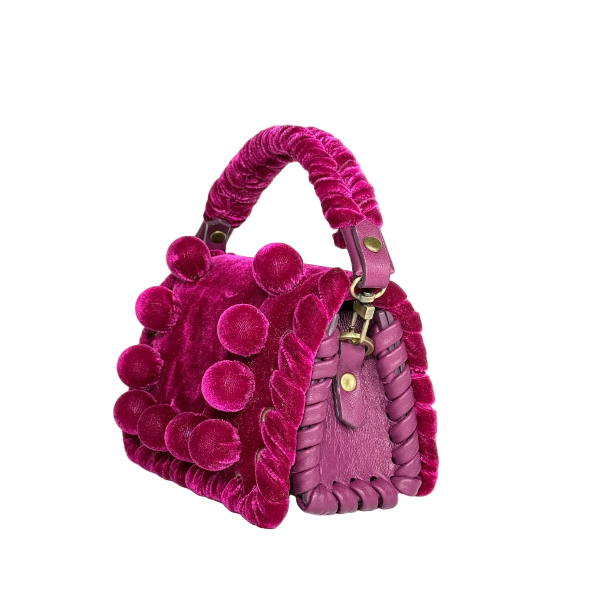 Our signature hand-sculpted velvet balls crown the design. The leather top handles echo the metal eyelets and velvet lacing, creating a beautifully cohesive interplay of materials and texture.
